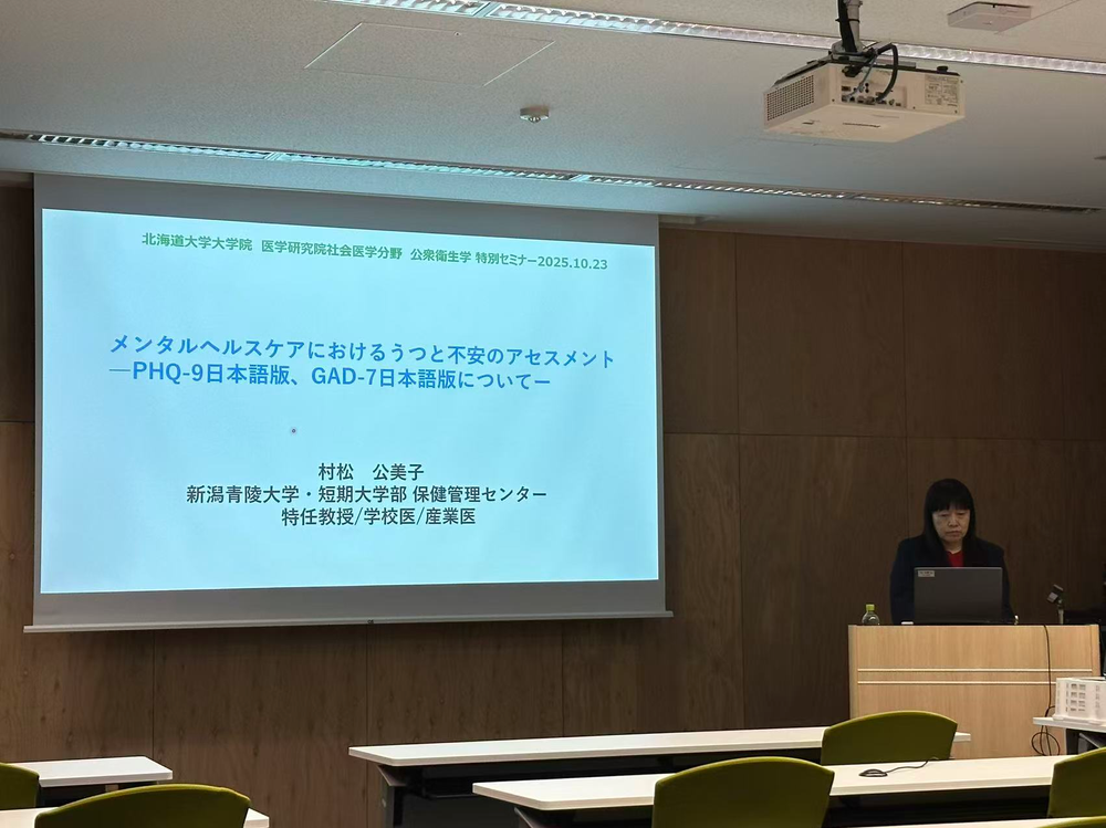 10月23日(水)、「メンタルヘルスケアにおけるうつと不安のアセスメント ―PHQ-9日本語版、GAD-7日本語版について―」というテーマで、新潟青陵大学・短期大学部 保健管理センター 特任教授の村松公美子先生にご講演いただきました。 ご講演では、先生がPHQ-9日本語版の開発者として、原版との出会いから翻訳・検証に至るまでの経緯を丁寧にお話しくださいました。翻訳における表現の微妙な違いや、文化的背景を考慮した尺度の調整など、実際の開発過程で直面した課題と工夫が紹介されました。また、日本における精神疾患のアセスメントの現状や、地域・プライマリケアにおける活用の可能性、さらに今後の展望についても幅広くお話しいただきました。 実践と研究の両面から、メンタルヘルス評価の重要性や、ツールが臨床現場で果たす役割について深く学ぶことができた貴重な機会となりました。 この度はご講演いただき、誠にありがとうございました。